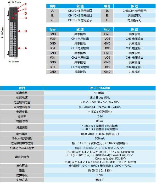EtherCAT 4 通道模擬輸出擴(kuò)展模塊 - R1-EC9144D0