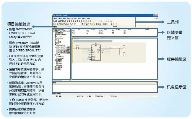 ISPSoft為臺達(dá)新一代的可程控器(PLC)開發(fā)工具,除了導(dǎo)入 IEC 61131-3 的編程架構(gòu),以多任務(wù)整合的方式來進(jìn)行項(xiàng)目的管理,亦提供臺達(dá)以及符合國際標(biāo)準(zhǔn)規(guī)格 PLCopen? 的功能塊,無論是單純的小型應(yīng)用,或是較為復(fù)雜的中大型控制系統(tǒng),ISPSoft都能提供使用者一個(gè)高效且便利的開發(fā)環(huán)境。